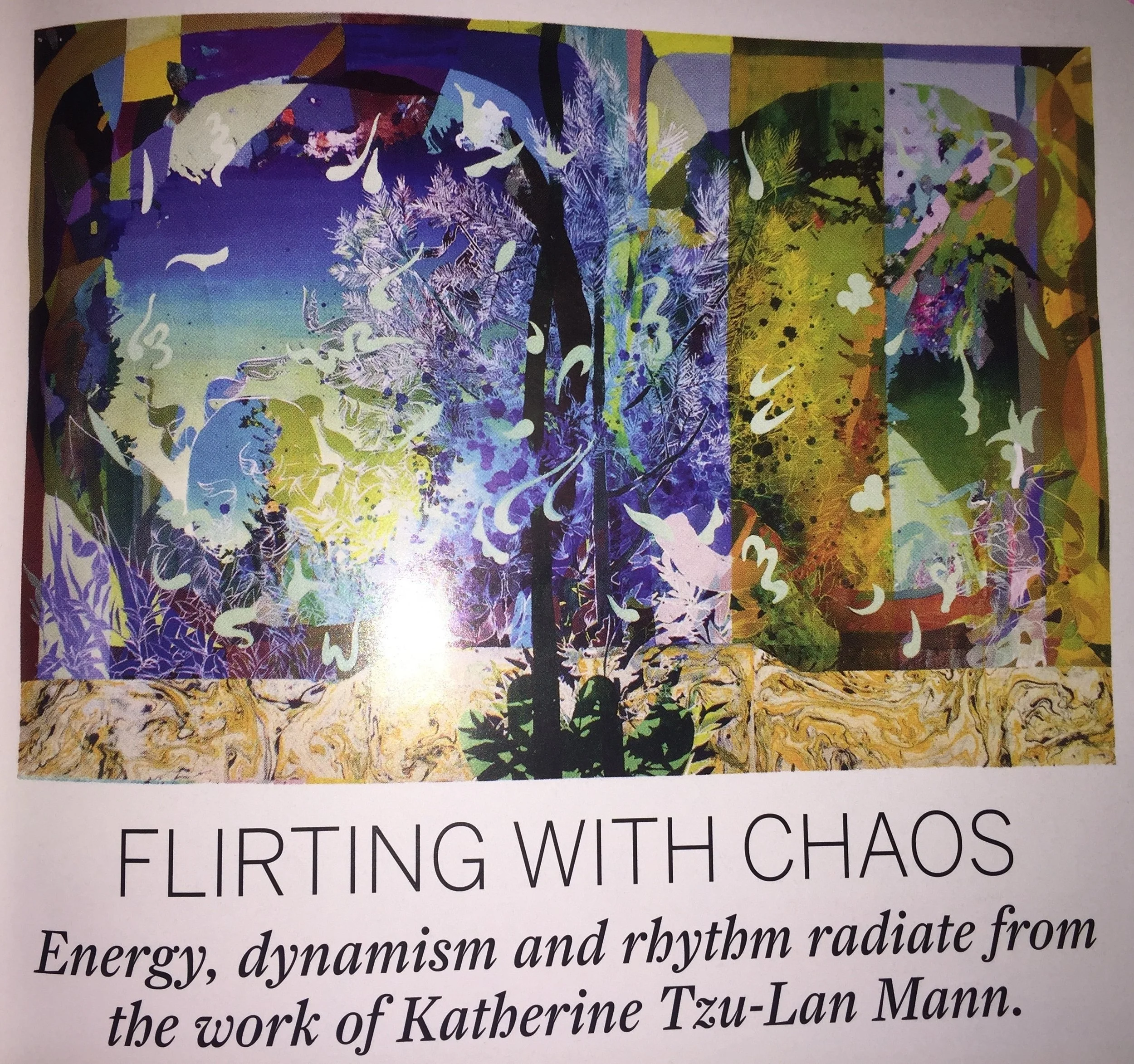 in Katherine Tzu-Lan’s painting process I discovered while reading about her in October 2018 Virginia Living is ironically the same as mine. We both begin each work with a “pour”, haphazardly pouring watered-down acrylic onto our flat surface. In her case, paper, and mine, raw (unprimed) canvas. This process apparently appeals to each of us as we enjoy the lack of control … the freedom of movement and happenchances that evolve. “This ‘chance operation’ becomes the starting point for the work.” Even though we haven’t met, I feel as though we’re kindred spirits.